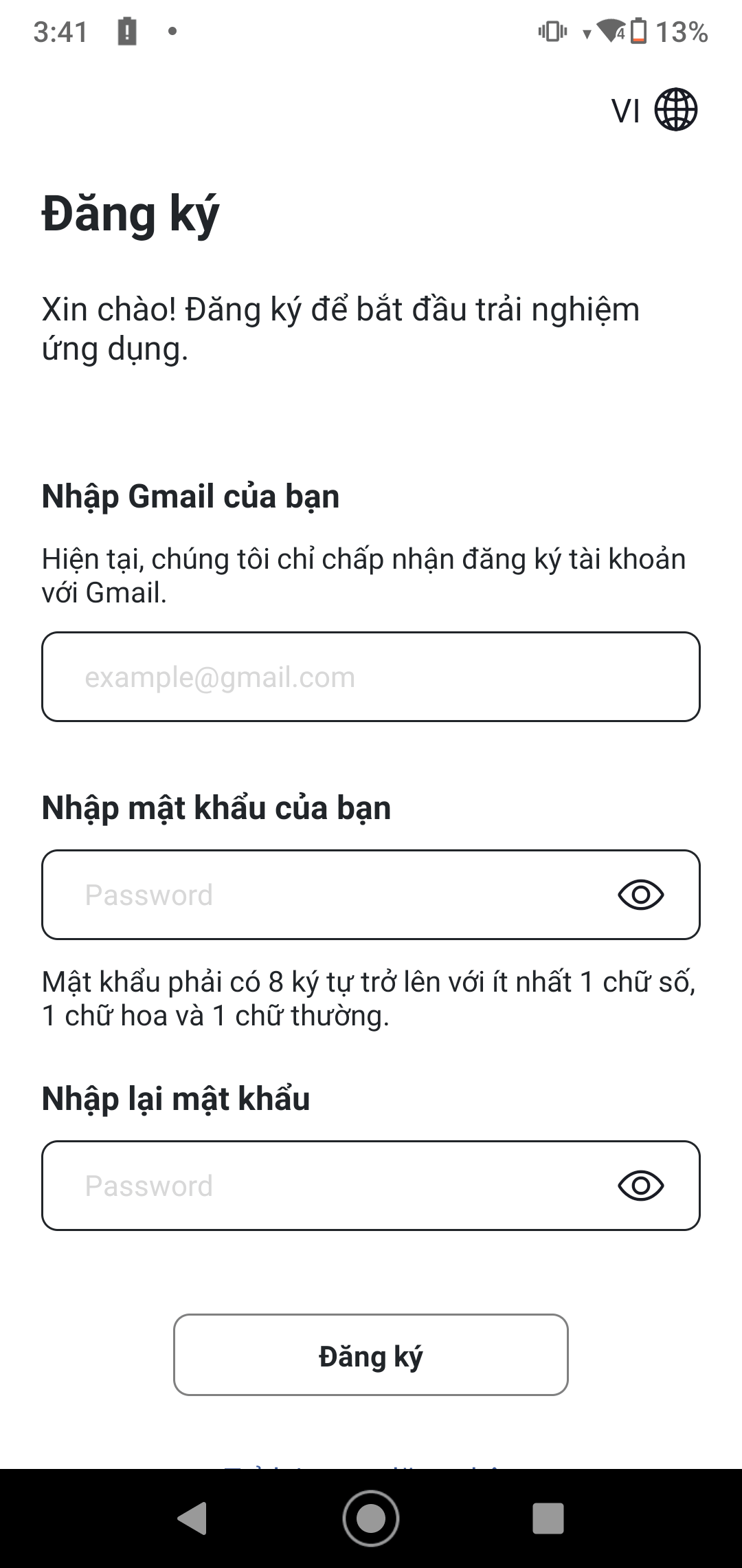 • Mật khẩu phải có 8 kí tự trở lên với ít nhất 1 chữ số, 1 chữ hoa và 1 chữ thường để đảm bảo độ khó.